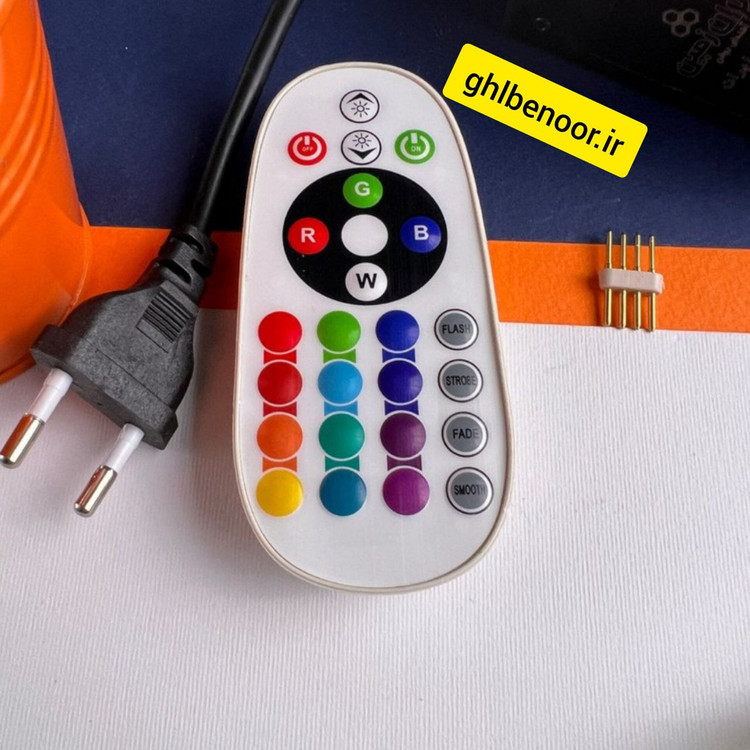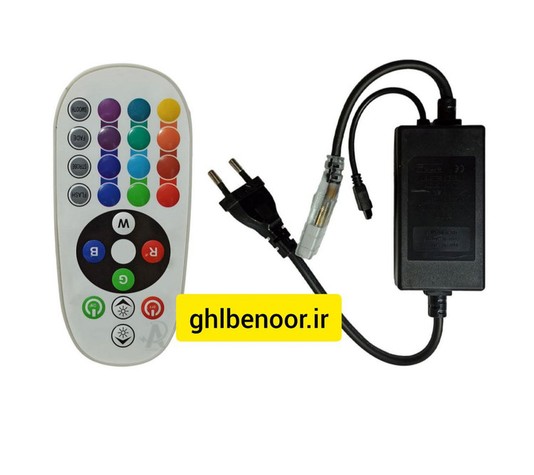 ریموت کنترل مادون قرمز RGB مولتی کالر مناسب برای انواع ریسههای شلنگی RGB است. این ریموت دارای 24 عدد دکمه برای تغییر رنگ و شدت نور ریسههای SMD است. این ریموت دارای یک دوشاخه است که به پریز برق شهری متصل شده و سمت دیگر آن به ریسه وصل میشود. آداپتور ریموت وظیفه تبدیل ولتاژ برق شهری (220 VAC) به ولتاژ مناسب برای ریسه را بر عهده دارد.